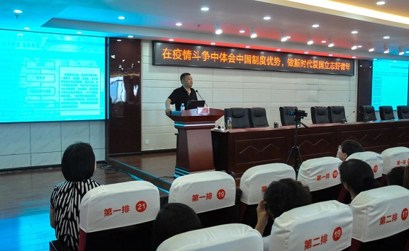 為加強學(xué)院思想政治工作,著力培養(yǎng)擔當民族復(fù)興大任的時代新人,幫助青年學(xué)生從情感認知升華為理性思考,進一步增強打贏疫情防控阻擊戰(zhàn)的信心決心,2020年5月8日上午,學(xué)院黨委副書記、院長邱國援為首批返回校園的學(xué)生上了一堂以“在疫情斗爭中體會中國制度優(yōu)勢,做新時代愛國立志好青年”為主題的思政課。