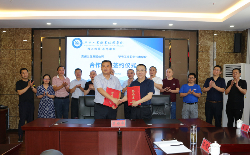 7月24日早上,我院與貴州出版集團(tuán)公司在同心樓三樓會議室舉行合作框架協(xié)議簽約儀式。貴州出版集團(tuán)公司黨委副書記常勇,貴州省新華書店有限公司黨委副書記、總經(jīng)理李健,畢節(jié)市新華書店有限公司總經(jīng)理王健,六盤水市新華書店有限公司總經(jīng)理鐘子杰,畢節(jié)工業(yè)職業(yè)技術(shù)學(xué)院黨委副書記、院長邱國援,黨委副書記付善華,黨委委員、副院長吳家文,黃河,黃文碧及相關(guān)部門負(fù)責(zé)人出席儀式。簽約儀式由吳家文主持。