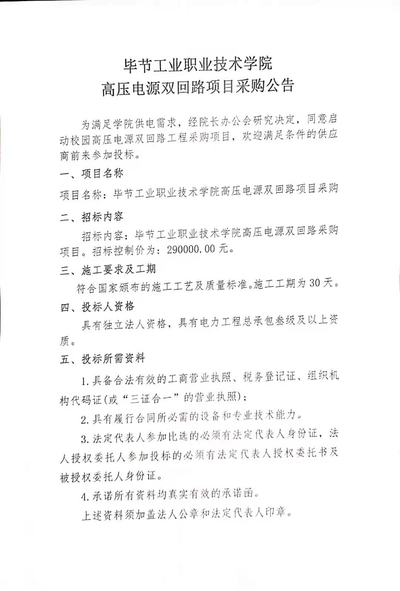 畢節(jié)工業(yè)職業(yè)技術(shù)學(xué)院高壓電源雙回路項(xiàng)目采購(gòu)公告
