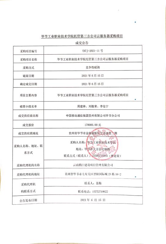 畢節(jié)工業(yè)職業(yè)技術(shù)學(xué)院托管第三方公司云服務(wù)器采購項(xiàng)目成交公告