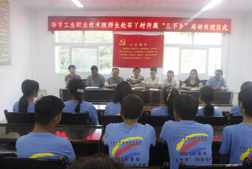 ▲畢節(jié)工業(yè)職業(yè)技術學院師生赴石丫村開展“三下鄉(xiāng)”活動歡迎儀式暨村干部為實踐隊員上入村第一課