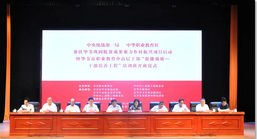 2021年7月18日上午,中央統(tǒng)戰(zhàn)部、中華職業(yè)教育社幫扶畢節(jié)鞏固脫貧成果聚力鄉(xiāng)村振興項目啟動暨畢節(jié)市職業(yè)教育中高層干部“提能強(qiáng)質(zhì)——干部培養(yǎng)工程”培訓(xùn)班開班儀式在我院會議中心舉行。