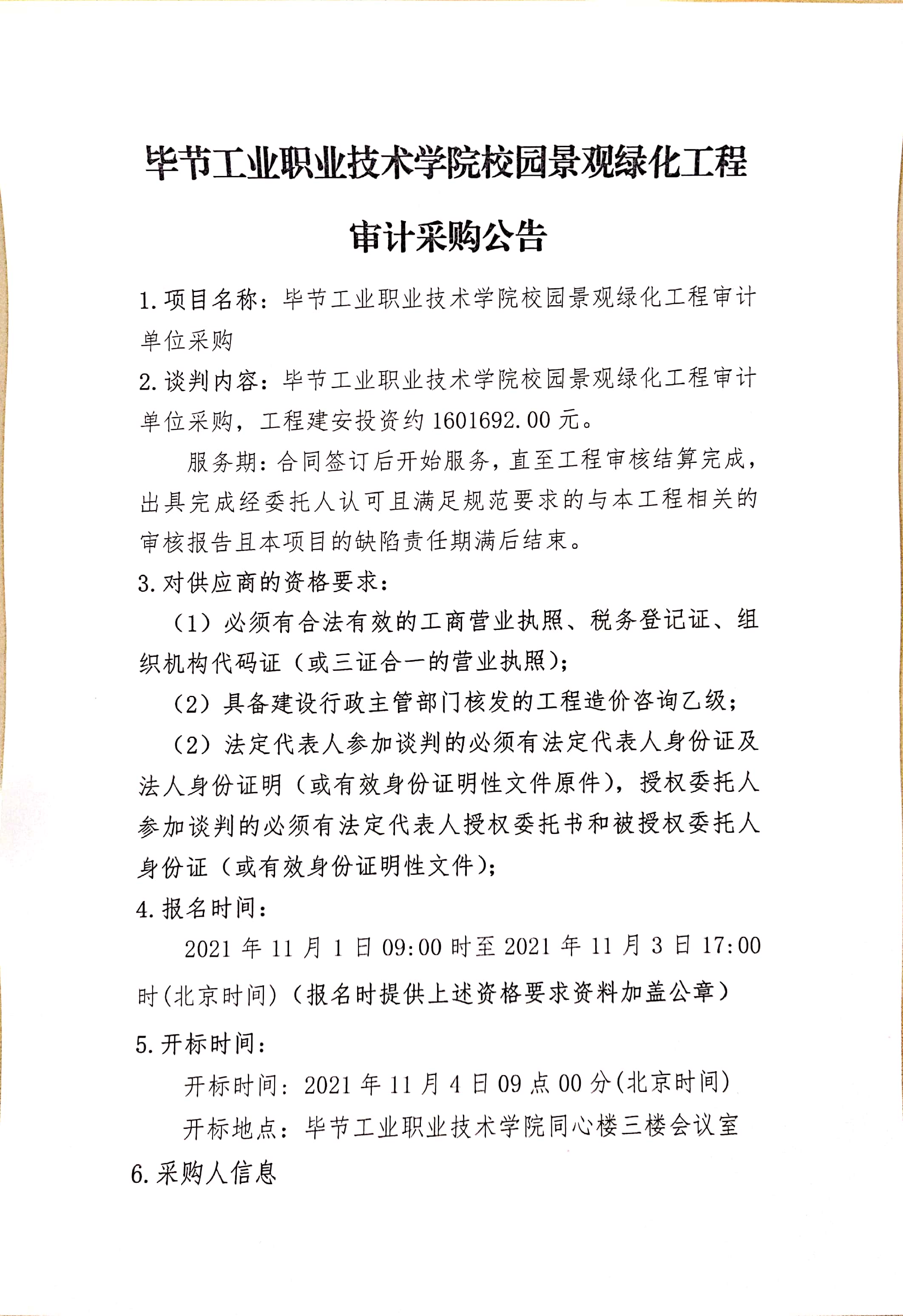畢節(jié)工業(yè)職業(yè)技術(shù)學(xué)院校園景觀綠化工程審計采購公告