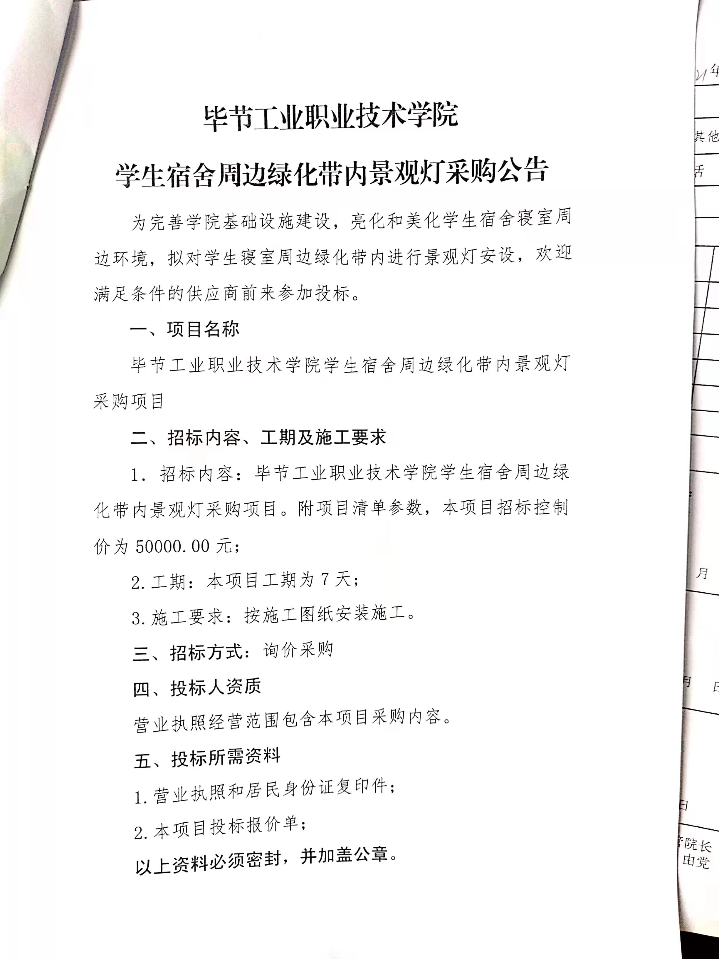 畢節(jié)工業(yè)職業(yè)技術(shù)學(xué)院學(xué)生宿舍周邊綠化帶內(nèi)景觀燈采購(gòu)公告