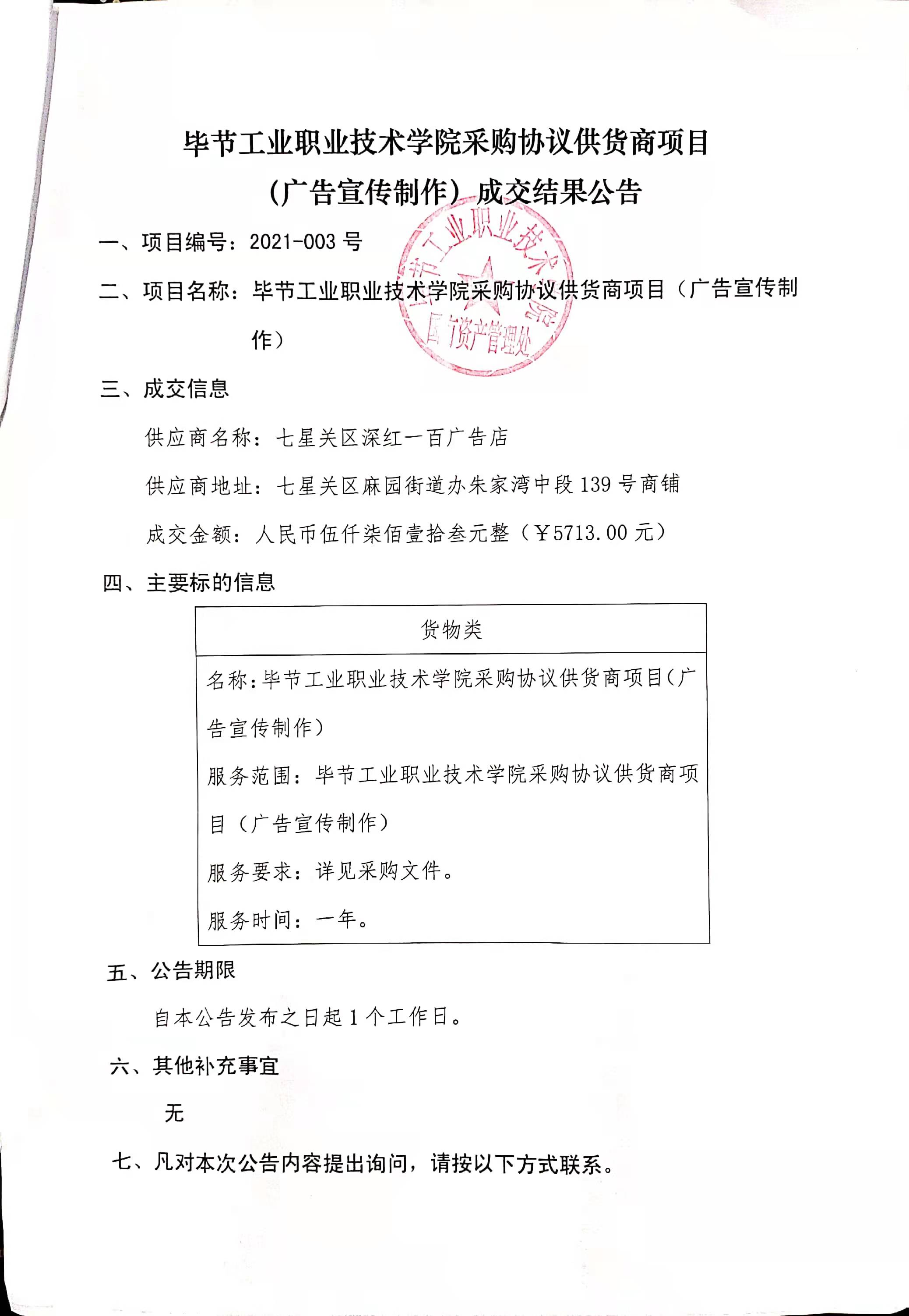 畢節(jié)工業(yè)職業(yè)技術(shù)學(xué)院采購協(xié)議供貨商項目(廣告宣傳制作)成交結(jié)果公告