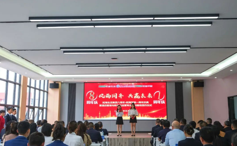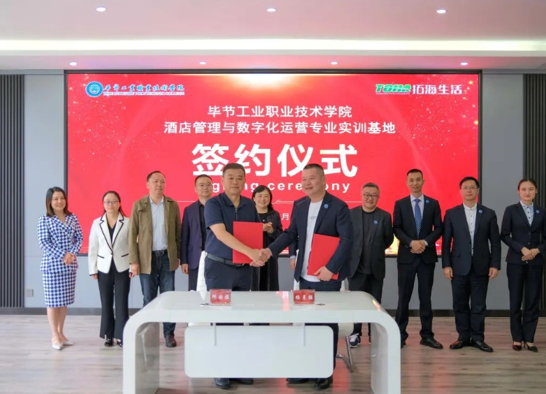 5月12日,畢節(jié)工業(yè)職業(yè)技術(shù)學(xué)院拓海學(xué)院一周年成立儀式暨畢節(jié)工業(yè)職業(yè)技術(shù)學(xué)院酒店管理與數(shù)字化運(yùn)營專業(yè)實(shí)訓(xùn)基地簽約儀式在拓海學(xué)院會議室舉行。學(xué)院黨委副書記、院長邱國援,黨委委員、副院長黃瑛、黃河、吳家文、黃文碧,拓海學(xué)院名譽(yù)院長、拓海生活集團(tuán)總裁楊月強(qiáng),拓海學(xué)院院長林彬出席儀式,拓海集團(tuán)相關(guān)領(lǐng)導(dǎo)、員工代表及學(xué)院社會服務(wù)系師生代表參加儀式。 儀式現(xiàn)場 邱國援在致辭中指出,校企雙方共建拓海學(xué)院實(shí)訓(xùn)基地,為相關(guān)專業(yè)學(xué)生提供了理實(shí)一體化教學(xué)場地和實(shí)習(xí)實(shí)訓(xùn)平臺,改善了物業(yè)管理、酒店管理等專業(yè)的教學(xué)、實(shí)訓(xùn)條件,使我院辦學(xué)條件、人才培養(yǎng)體系和教學(xué)質(zhì)量得到不斷提高。同時,拓海集團(tuán)積極參與物業(yè)管理專業(yè)人才培養(yǎng)方案修訂,從行業(yè)、企業(yè)角度提出了很多人才培養(yǎng)的意見建議,邀請行業(yè)專家來校講學(xué),親自授課,使學(xué)生專業(yè)知識得到有力提升,使物業(yè)管理專業(yè)人才培養(yǎng)體系更加符合行業(yè)需求。下一步,希望校企雙方繼續(xù)深化校企合作機(jī)制、持續(xù)擴(kuò)大合作范圍、協(xié)同提升合作質(zhì)量,充分發(fā)揮拓海生活服務(wù)集團(tuán)在物業(yè)管理方面的專業(yè)優(yōu)勢,在人才培養(yǎng)方案、課程教學(xué)、實(shí)習(xí)實(shí)訓(xùn)、教師培養(yǎng)等方面提供企業(yè)建議和技術(shù)指導(dǎo),在教育教學(xué)、學(xué)生管理、素質(zhì)培養(yǎng)、技能提升等方面與學(xué)院交換經(jīng)驗(yàn),提升教師專業(yè)素質(zhì),強(qiáng)化學(xué)生技能提升,推進(jìn)“工學(xué)結(jié)合”教學(xué)模式,共同提高學(xué)院育人質(zhì)量。 邱國援在儀式上致辭 楊月強(qiáng)表示,過去一年,校企雙方本著優(yōu)勢互補(bǔ)、資源共享、互惠雙贏、共同發(fā)展的原則,對校企合作模式進(jìn)行了深層次的探索、創(chuàng)新與實(shí)踐,拓海學(xué)院的成立不僅推動了產(chǎn)教融合,也為學(xué)生提供了優(yōu)質(zhì)的實(shí)訓(xùn)基地,為企業(yè)提供了強(qiáng)有力的人才保障。下一步,企業(yè)將繼續(xù)聯(lián)手學(xué)院不斷創(chuàng)新,共同培養(yǎng)高素質(zhì)技術(shù)技能型人才,構(gòu)建校企合作雙贏局面,助推職業(yè)教育改革和地方經(jīng)濟(jì)社會高質(zhì)量發(fā)展。 楊月強(qiáng)在儀式上講話 儀式上,邱國援代表學(xué)院與拓海生活集團(tuán)簽訂了《畢節(jié)工業(yè)職業(yè)技術(shù)學(xué)院酒店管理與數(shù)字化運(yùn)營專業(yè)實(shí)訓(xùn)基地(中心)建設(shè)合作協(xié)議》。學(xué)院與拓海生活集團(tuán)將再次攜手,共建畢節(jié)工業(yè)職業(yè)技術(shù)學(xué)院酒店管理與數(shù)字化運(yùn)營專業(yè)實(shí)訓(xùn)基地,共同承擔(dān)科研項(xiàng)目、實(shí)現(xiàn)信息共享,培養(yǎng)更多高質(zhì)量的技能人才,為畢節(jié)全面推進(jìn)鄉(xiāng)村振興提供有力的人才支撐。 簽約儀式現(xiàn)場 拓海學(xué)院院長林斌、社會服務(wù)系主任呂振欣為優(yōu)秀學(xué)生羅達(dá)麗、李定奎頒發(fā)榮譽(yù)證書 優(yōu)秀學(xué)生代表羅達(dá)麗發(fā)言 儀式中的精彩節(jié)目