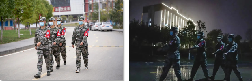 在學院實施靜默管理至今,校園內(nèi)總能見到一個個身穿迷彩服,英姿颯爽的身影,他們同一線抗疫人員站在一起,默默進行著日常巡邏、定點值守、秩序維護、隱患排查等工作,成為了織密織牢學院疫情防控網(wǎng)的重要一環(huán)。