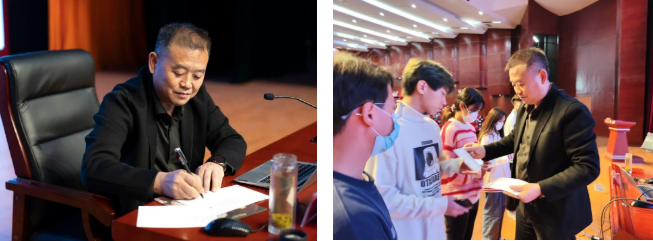 “祝你生日快樂……”隨著背景音樂響起,過生日的同學(xué)們帶著驚喜的笑容走上講臺(tái),享受著這份專屬的溫馨,現(xiàn)場(chǎng)氣氛熱烈,在場(chǎng)同學(xué)們熱情地送上陣陣掌聲與歡呼?!安回?fù)韶華、砥礪前行,做有理想、有信念、有擔(dān)當(dāng)?shù)男聲r(shí)代高素質(zhì)技能人才”“奮發(fā)前行,做與眾不同的畢節(jié)工職院技能型新青年”……一句句寫在明信片上的青春寄語既是院長(zhǎng)對(duì)新同學(xué)的期待,更是院長(zhǎng)對(duì)新同學(xué)特別生日的別樣祝福。 在16位同學(xué)的生日“大禮包”中,一張親筆簽名的青春寄語明信片成為最有意義的“生日祝?!?。明信片的正面展現(xiàn)了校園內(nèi)一年四季的美景與青春芳華,表達(dá)了學(xué)院對(duì)新同學(xué)的歡迎與祝福。而在明信片的背面,是一句句手寫的青春寄語與院長(zhǎng)的親筆簽名,將思政融于校園生活,用生動(dòng)具體的祝福引導(dǎo)新同學(xué)扣好人生的“第一??圩印保龑?dǎo)同學(xué)們珍惜時(shí)光、不負(fù)韶華、不負(fù)青春。這場(chǎng)別樣的“開學(xué)第一課”,讓同學(xué)們剛進(jìn)入學(xué)校就感受到了畢節(jié)工職院這個(gè)大家庭的溫暖。 機(jī)電工程系學(xué)生高安會(huì)說:“今天是一個(gè)特別的日子,我19歲了,在沒有家人的陪伴下過生日,心里未免有些許失落,但在“開學(xué)第一課”看到我跟其他同學(xué)的姓名出現(xiàn)在會(huì)場(chǎng)的屏幕上,緊接著邱院長(zhǎng)和同學(xué)為我們送上生日的祝福,真是既驚喜又感動(dòng),對(duì)我來說這是19年以來最為難忘的一次生日。作為一名大學(xué)生,我會(huì)時(shí)刻提醒自己,珍惜在大學(xué)生活的每一分每一秒,不讓時(shí)光虛度。” 信息工程學(xué)生廖英杰說:“報(bào)到當(dāng)天就真切地感受到了老師、同學(xué)們的熱情,在今天這個(gè)特別的日子,我還收到了學(xué)校領(lǐng)導(dǎo)親手寫的明信片,這份入學(xué)‘禮物’讓我們特別高興,也感到特別溫馨?!?/p> 土木工程系同學(xué)歐宇鵬說:“今天收到的禮物對(duì)我來說有著很特別的意義。里面飽含著學(xué)校和院長(zhǎng)對(duì)我們的期望,我一定會(huì)努力學(xué)習(xí)、不斷提升自己的能力,發(fā)揮自己的價(jià)值,做一個(gè)對(duì)社會(huì)有用的人?!?/p>