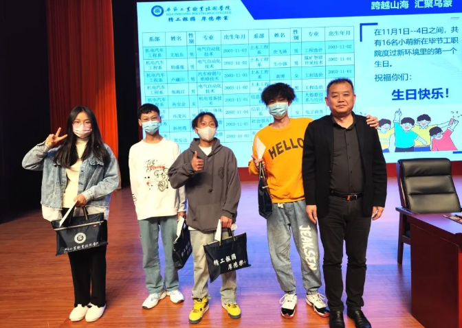 10月29日至11月1日,畢節(jié)工業(yè)職業(yè)技術(shù)學(xué)院迎來了近3000名“小可愛”。在11月2日-3日開展的“開學(xué)第一課“上,學(xué)院黨委副書記、院長(zhǎng)邱國(guó)援為過生日的16位同學(xué)送上了一份精心準(zhǔn)備的禮物,通過別樣的祝福引導(dǎo)新同學(xué)扣好人生的“第一??圩印?,讓他們?cè)诔錆M驚喜和愉悅的氣氛下度過了進(jìn)入畢節(jié)工職院的第一個(gè)特別的生日。