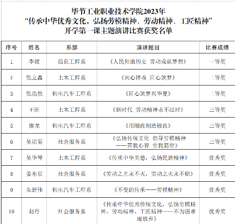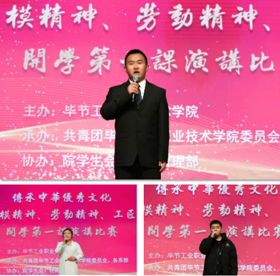3月28日,畢節(jié)工業(yè)職業(yè)技術(shù)學(xué)院在會(huì)議中心舉辦“傳承中華優(yōu)秀傳統(tǒng)文化,弘揚(yáng)勞模精神、勞動(dòng)精神、工匠精神開學(xué)第一課”主題演講比賽?;顒?dòng)旨在學(xué)習(xí)貫徹黨的二十大精神、習(xí)近平總書記在全國高校思想政治工作會(huì)議上的講話精神,傳承中華優(yōu)秀傳統(tǒng)文化,弘揚(yáng)勞模精神、勞動(dòng)精神、工匠精神,踐行社會(huì)主義核心價(jià)值觀。