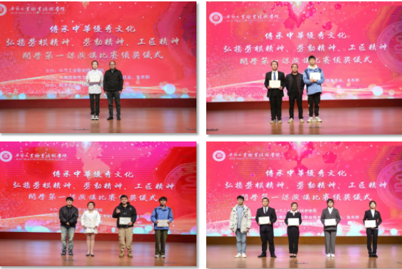 比賽現(xiàn)場(chǎng),十二位參賽選手緊扣活動(dòng)主題,結(jié)合自身學(xué)習(xí)心得體會(huì),用質(zhì)樸的語言、飽滿的熱情、真摯的情感從不同角度詮釋了勞模精神、勞動(dòng)精神、工匠精神,激勵(lì)和鼓舞同學(xué)們積極投身全面建設(shè)社會(huì)主義現(xiàn)代化國家的偉大實(shí)踐。各位選手言辭流利、妙語連珠,現(xiàn)場(chǎng)精彩的演講贏得了評(píng)委和觀眾們的陣陣掌聲。 經(jīng)過激烈角逐,評(píng)委組從演講內(nèi)容、語言表達(dá)、形象風(fēng)度、綜合印象、會(huì)場(chǎng)效果等方面對(duì)參賽選手的演講進(jìn)行了評(píng)分,評(píng)選出一、二、三等獎(jiǎng)及優(yōu)秀獎(jiǎng),機(jī)電汽車工程系獲得優(yōu)秀組織獎(jiǎng)。隨即舉行了頒獎(jiǎng)儀式。 據(jù)悉,此次比賽獲得前三名的選手將代表學(xué)院參加省級(jí)比賽,預(yù)祝他們?nèi)〉昧己玫某煽儯?/p>