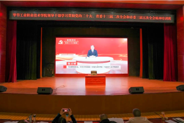 5月8日-12日,學(xué)院黨委組織開展了畢節(jié)工業(yè)職業(yè)技術(shù)學(xué)院領(lǐng)導(dǎo)干部學(xué)習(xí)貫徹黨的二十大、省委十三屆二次全會、市委三屆五次全會精神培訓(xùn)。副科級及以上干部共70余人參加培訓(xùn)。