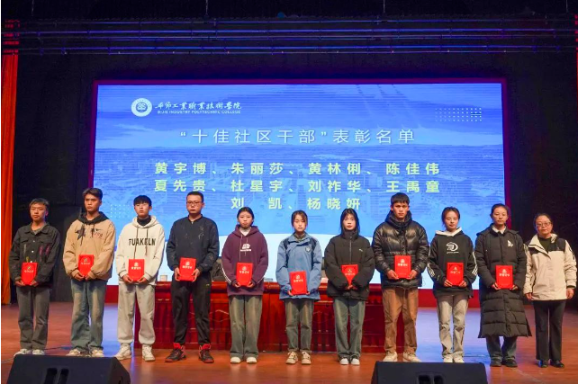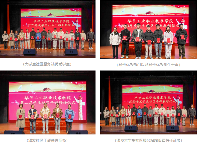 12月6日,畢節(jié)工業(yè)職業(yè)技術(shù)學(xué)院“一站式”學(xué)生社區(qū)干部表彰及聘任儀式在多功能廳召開。學(xué)院黨委委員、副院長黃文碧出席儀式并為受表彰和聘任的同學(xué)頒獎,學(xué)生工作處負責(zé)人胡永祚主持會議并為大學(xué)生社區(qū)服務(wù)站優(yōu)秀學(xué)生頒發(fā)榮譽證書。學(xué)院相關(guān)部門主要負責(zé)人,社區(qū)管理委員會、易班工作及系部師生代表800余人參加儀式。