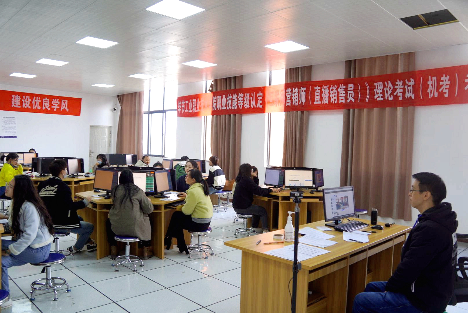 為了促進(jìn)我院“雙師型”隊(duì)伍建設(shè),提升教師技能成長(zhǎng),弘揚(yáng)工匠精神,經(jīng)貴州省職業(yè)技能鑒定指導(dǎo)中心批準(zhǔn),我院2023年第二批職業(yè)技能等級(jí)認(rèn)定考試--《直播銷售員》(三、四級(jí))考試工作圓滿完成。