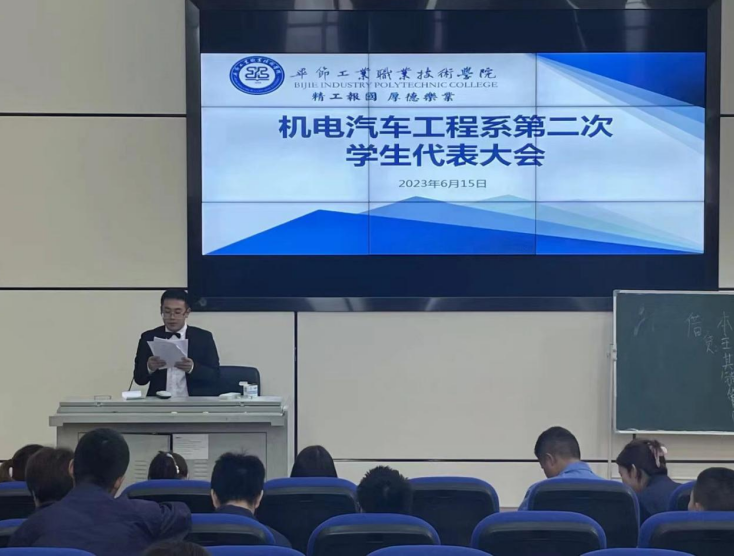 2023年6月15日,畢節(jié)工業(yè)職業(yè)技術(shù)學(xué)院機(jī)電汽車(chē)工程系第二次學(xué)生代表大會(huì)在括海學(xué)院二樓會(huì)議室召開(kāi)。第一階段,到會(huì)的領(lǐng)導(dǎo)及嘉賓一同奏唱國(guó)歌,機(jī)電工程系負(fù)責(zé)人張建為大會(huì)致開(kāi)幕詞,院團(tuán)委負(fù)責(zé)人伍紹平老師宣讀了團(tuán)委批復(fù),系部黨總支張禾書(shū)記宣讀黨總支批復(fù),宣讀完畢后到會(huì)領(lǐng)導(dǎo)及嘉賓進(jìn)行了合影留戀。