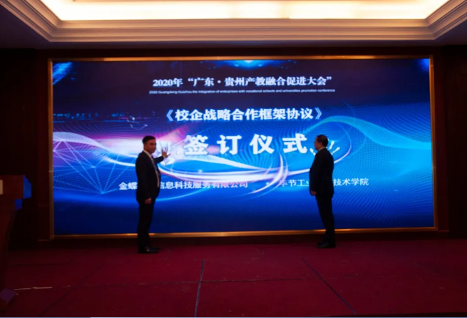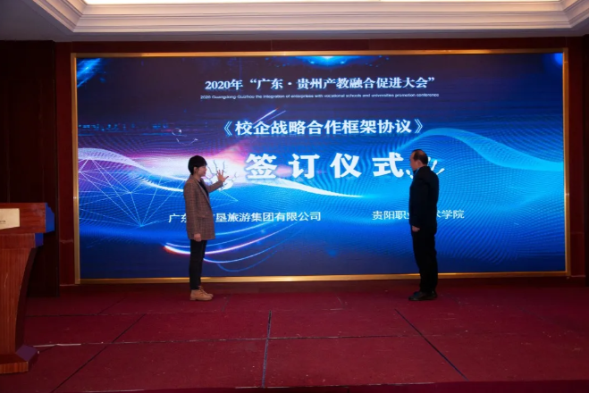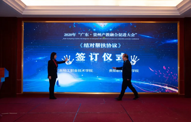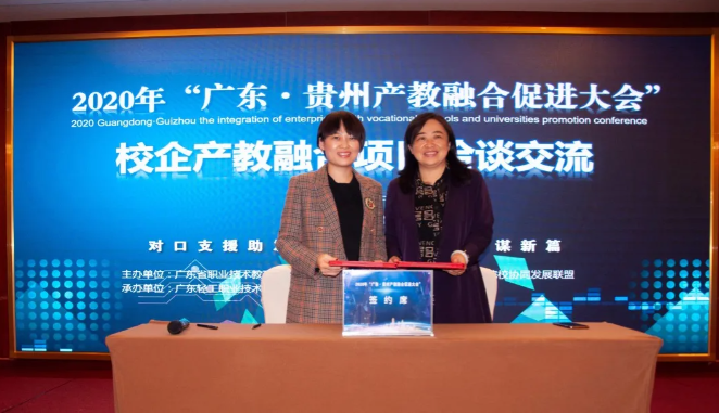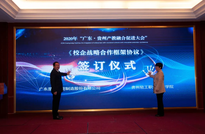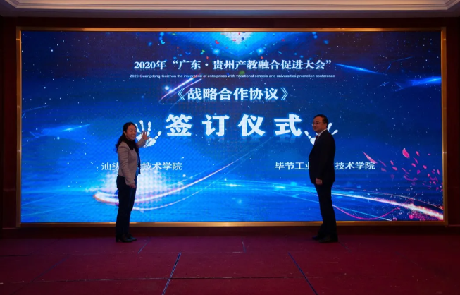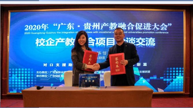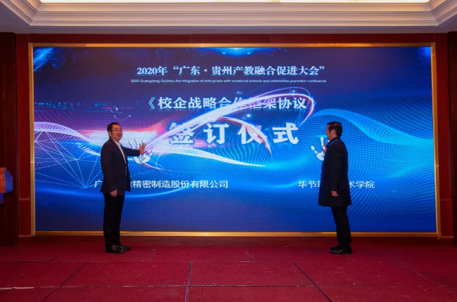 東西部協(xié)作,產(chǎn)教融合助發(fā)展。對深入推動(dòng)產(chǎn)教融合、校企合作、專業(yè)布局緊扣產(chǎn)業(yè)發(fā)展、教育教學(xué)改革貼近人才培養(yǎng)需求等發(fā)揮了助推作用,將使貴州職業(yè)教育深化產(chǎn)教融合、校企合作打開一個(gè)全新的局面。 貴州省教育廳一級(jí)巡視員鞠洪在會(huì)上表示,隨著中央、省一系列政策、措施的出臺(tái)實(shí)施,產(chǎn)教融合發(fā)展將迎來更好的發(fā)展機(jī)遇。廣東·貴州產(chǎn)教融合促進(jìn)大會(huì)的召開,為我省各職業(yè)院校與廣東省的各行各業(yè)優(yōu)質(zhì)企業(yè)和職業(yè)院校交流溝通搭建了一個(gè)廣闊的平臺(tái)。期待通過這個(gè)平臺(tái),粵黔兩地能更大范圍、更寬領(lǐng)域、更深層次開展合作,實(shí)現(xiàn)廣東市場+貴州產(chǎn)品,廣東研發(fā)+貴州制造的融合發(fā)展。 廣東輕工職業(yè)技術(shù)學(xué)院黨委書記杜安國表示,落實(shí)廣黔結(jié)對幫扶舉措,發(fā)揮企業(yè)與教育的互促力量,在廣東·貴州產(chǎn)教融合促進(jìn)大會(huì)的廣闊平臺(tái)上,為校企合作牽線搭橋,共同建立長期緊密的合作關(guān)系,促進(jìn)職業(yè)教育高質(zhì)量發(fā)展,實(shí)現(xiàn)職教幫扶促發(fā)展,產(chǎn)教融合謀新篇。 發(fā)揮自身優(yōu)勢,助力合作共贏。畢節(jié)市人民政府副市長胡愛斌在會(huì)中坦言,落實(shí)東西部扶貧協(xié)作,畢節(jié)要盡其資源,提升兩省兩市的產(chǎn)教契合度,圍繞自身的優(yōu)勢,加強(qiáng)廣東企業(yè)和貴州教育的結(jié)合優(yōu)勢,為畢節(jié)打造更多的“畢工強(qiáng)將”、奮力人才! 會(huì)上,廣東省向貴州職業(yè)院校捐贈(zèng)阿里云智慧校園3.0系統(tǒng),廣州市億科計(jì)算機(jī)公司向畢節(jié)工業(yè)職業(yè)技術(shù)學(xué)院捐贈(zèng)智慧黨建系統(tǒng);相關(guān)企業(yè)與院校簽訂人才專業(yè)培養(yǎng)、訂單班、校企戰(zhàn)略合作、產(chǎn)教融合項(xiàng)目20余項(xiàng)。廣東星徽精密制造股份有限公司代表參會(huì)企業(yè)進(jìn)行發(fā)言,10余家企業(yè)進(jìn)行了產(chǎn)教融合案例分享。 會(huì)中,許多學(xué)校和企業(yè)單位都精彩紛呈的展示了“自家”的優(yōu)勢及未來發(fā)展。很多校企單位在行程中便互相洽談、簽約,這些成功的簽約對產(chǎn)教融合,校企合作有了更深的意義,推進(jìn)了產(chǎn)教融合,校企合作,校校合作的進(jìn)程,引領(lǐng)時(shí)代的新篇章。 廣東?貴州產(chǎn)教融合促進(jìn)大會(huì)在畢節(jié)召開,既是山與海的對話,更是心與心的交流。職業(yè)教育的目標(biāo)是培養(yǎng)技能型的人才,深化走產(chǎn)教融合,校企合作之路,加強(qiáng)產(chǎn)教融合,校企合作,達(dá)到互惠互利,合作共贏的優(yōu)勢,共同培育新時(shí)代高技能人才。